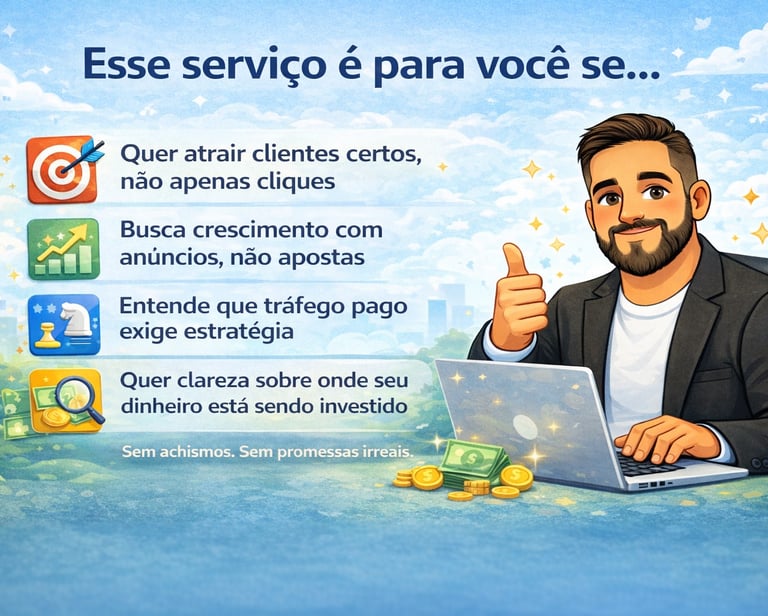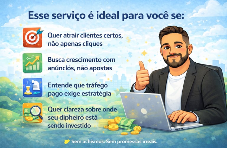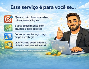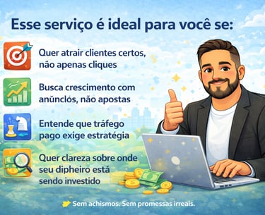 Transformo anúncios em oportunidades reais de venda, focando no público certo, no momento certo e com decisões baseadas em dados.